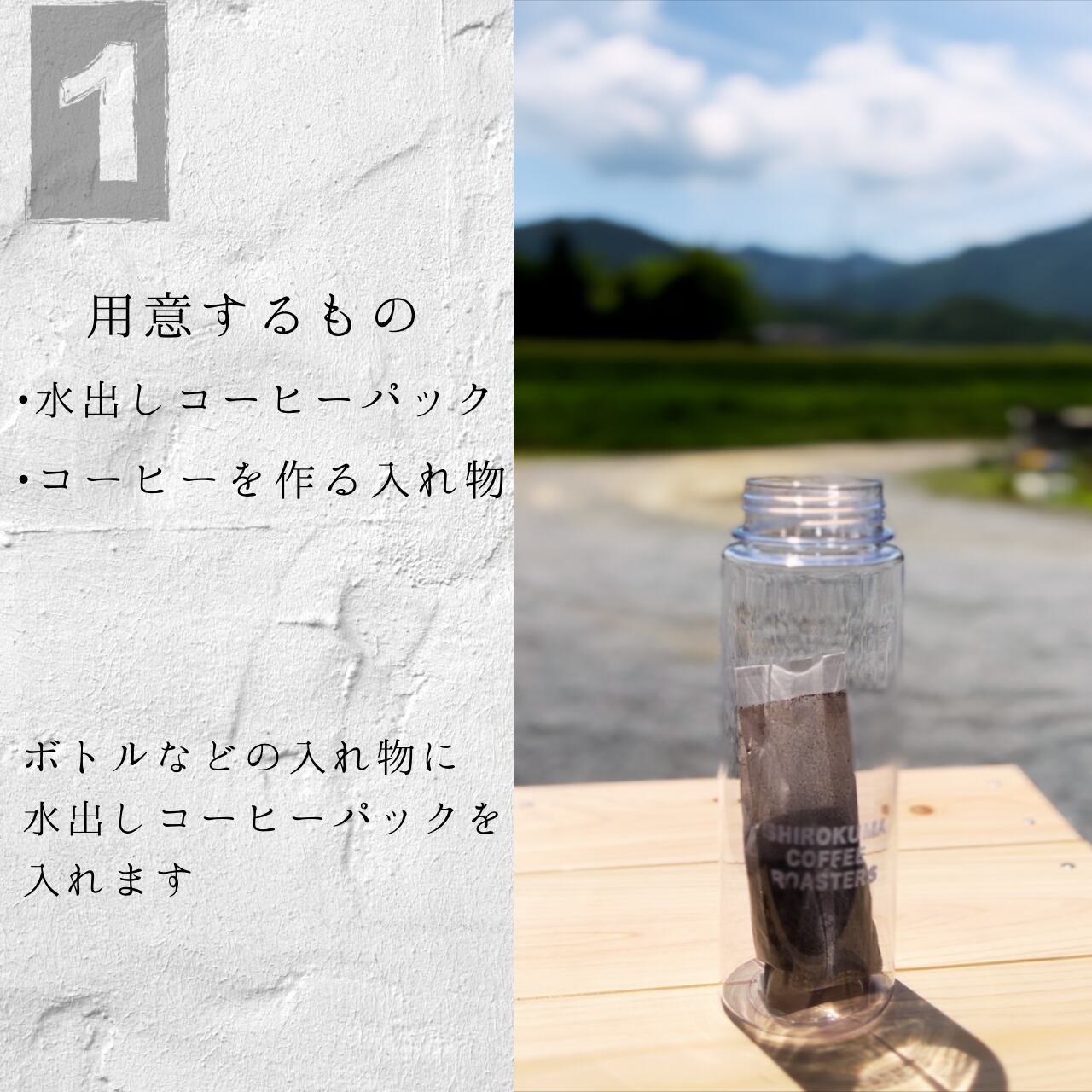 20gのコーヒーパックを、ボトルなどに入れて、そこに250mlの水を入れる。